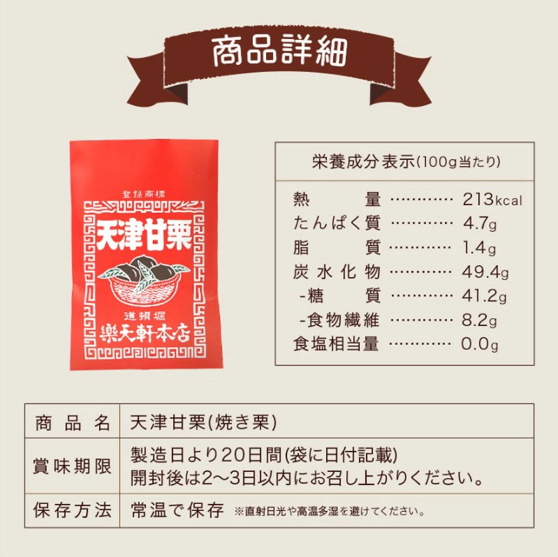 創業120年以上の歴史を誇る老舗「樂天軒」が厳選した良質な栗を、熟練の職人が香ばしく焼き上げた定番の 天津甘栗(特大サイズ 1000g) です。栗本来の自然な甘みと風味を活かし、素朴でやさしい味わいに仕上げました。添加物・保存料は一切使用しておらず、お子さまからご年配の方まで安心してお召し上がりいただけます。
