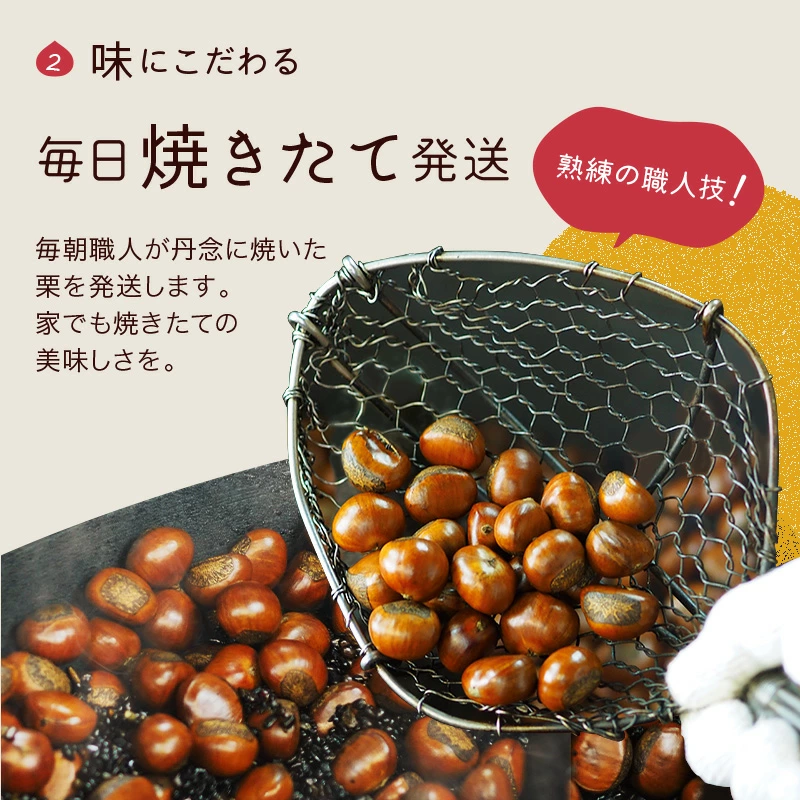 厳選した良質な栗を直輸入し、特殊製法で香ばしく焼き上げた、素朴で豊かな甘みのある栗本来のおいしさをお楽しみいただけます。