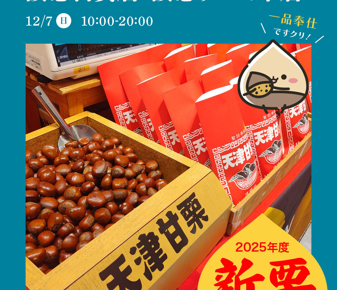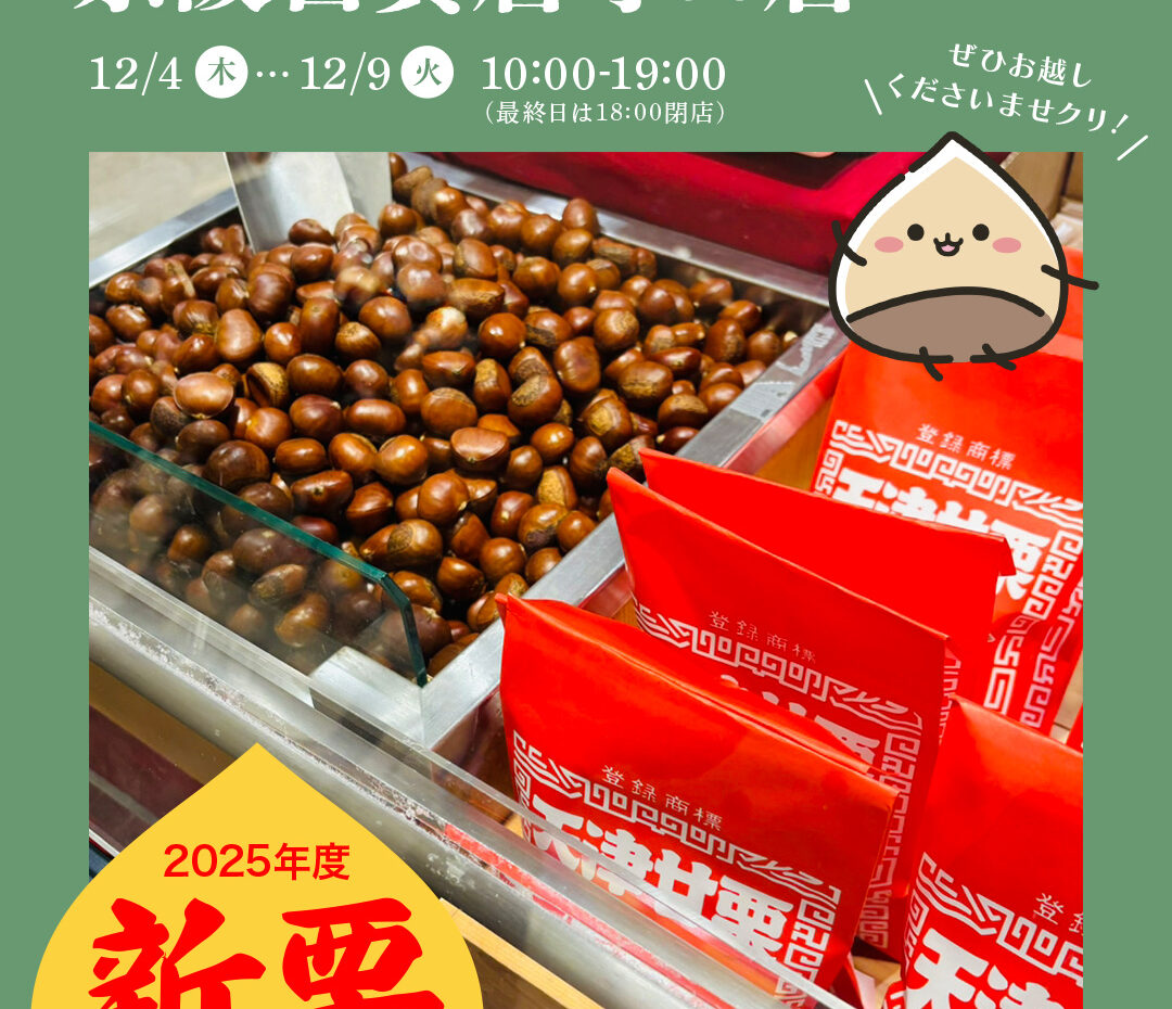 11月26日 ~ 12月2日 大丸松阪屋百貨店 梅田店 🌰【大丸松阪屋百貨店 梅田店】催事のお知らせ🌰 【新栗入荷!!】お待たせしました!2025年収穫の新栗が登場します!! 11/26 (水)~12/2(火)の間、「大丸松...