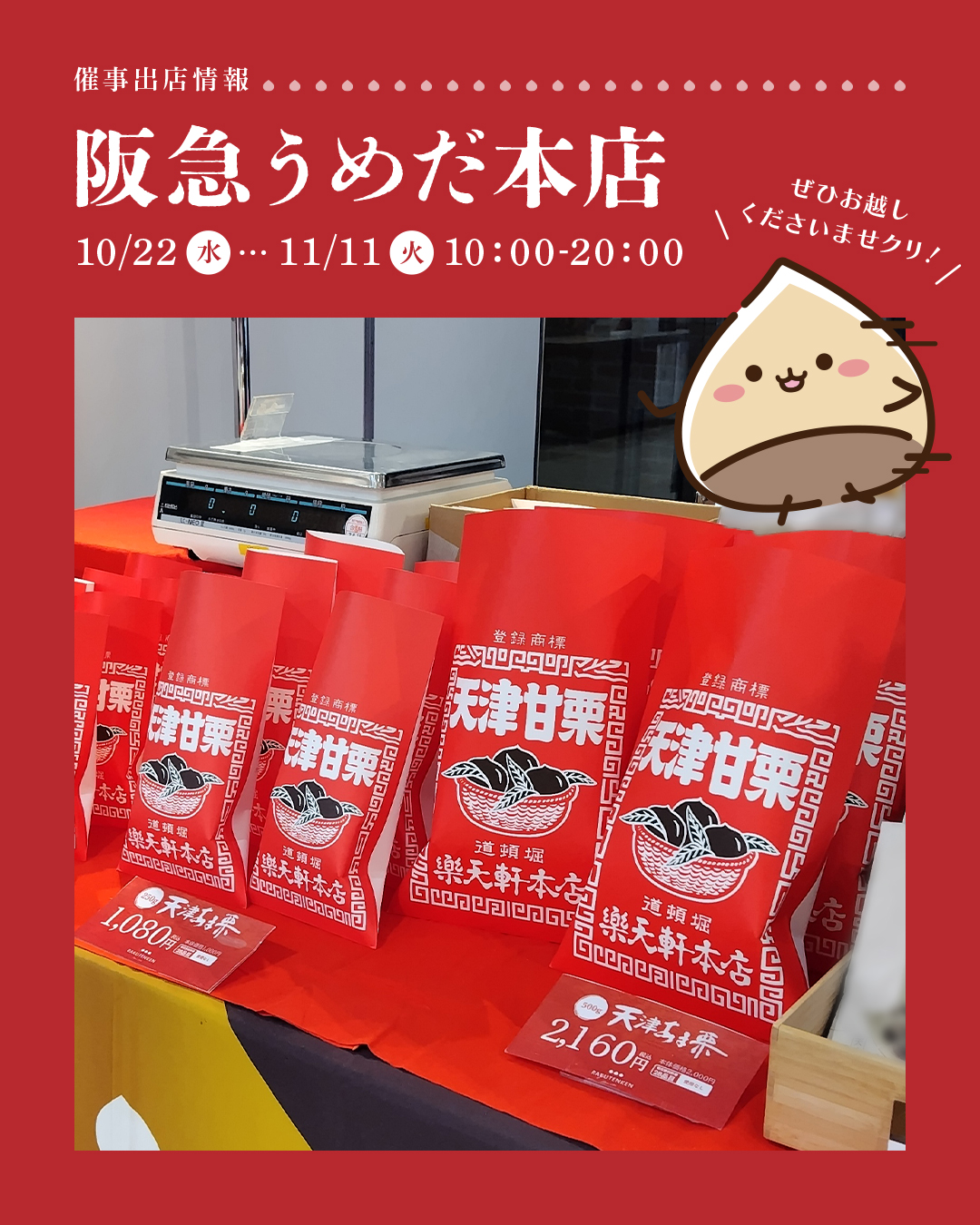 #催事出店 #大阪 #関西グルメ #関西  #大阪催事 #関西土産 #お土産 #おみやげ #阪急 #地下1階 #梅田 #阪急梅田 #イベント #百貨店 #阪急うめだ #天津甘栗 #ほくほく #栗 #甘栗 #マロン#プレゼント #ギフト #樂天軒 #楽天軒 #RAKUTENKEN